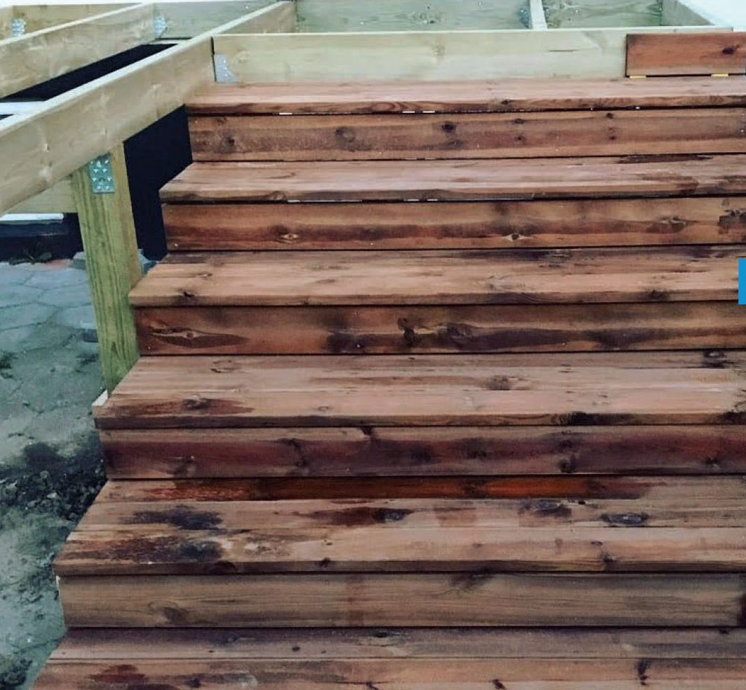 Nämä portaat tehdään itse, jotta niistä tulee juuri oikean kokoiset. Portaat tehdään palkeista, mutta ne asennetaan painekyllästettyjen lankkujen päälle, jotka kestävät paremmin vettä.