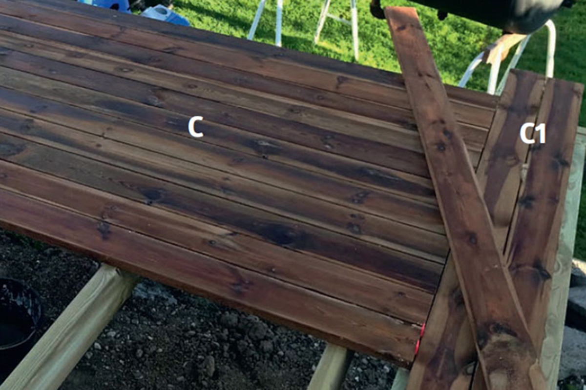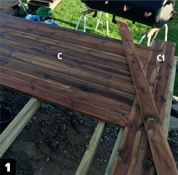 Asenna kaksi terassilautaa (C1), jotka jakavat terassin kahteen kenttään. Asenna sen jälkeen loput terassilaudat (C) niitä vasten.