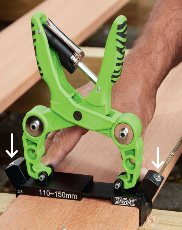 Ruuvaa terassilaudat (C) kiinni ruostumattomilla terassiruuveilla. Tässä käytetään Essven HDS-asennustyökalua.