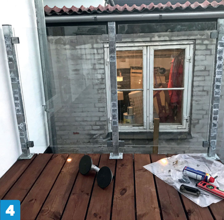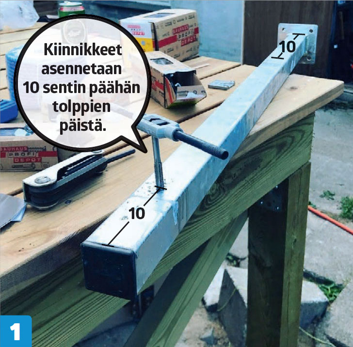 Ruuvaa galvanoidut tolpat kiinni terassiin. Tarkista linjalangalla, että tolpat ovat suorassa linjassa. Se on tärkeää, jotta kiinnikkeet osuvat lasien kohdalle.