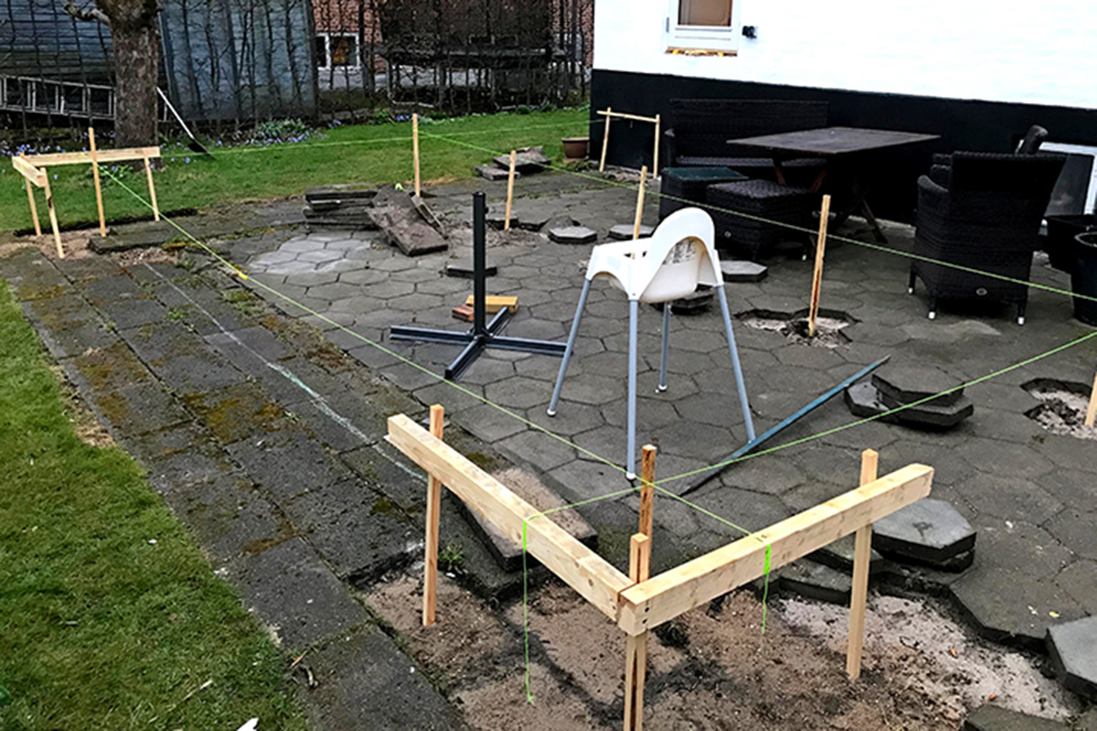 Ennen ensimmäistä lapionpistoa terassin nurkkiin kannattaa pystyttää pienet kepit. Viritä niiden väliin linjalangat ja katso, oletko tyytyväinen terassin kokoon. Linjalangoilla on helppo varmistaa, että terassista tulee suorakulmainen.