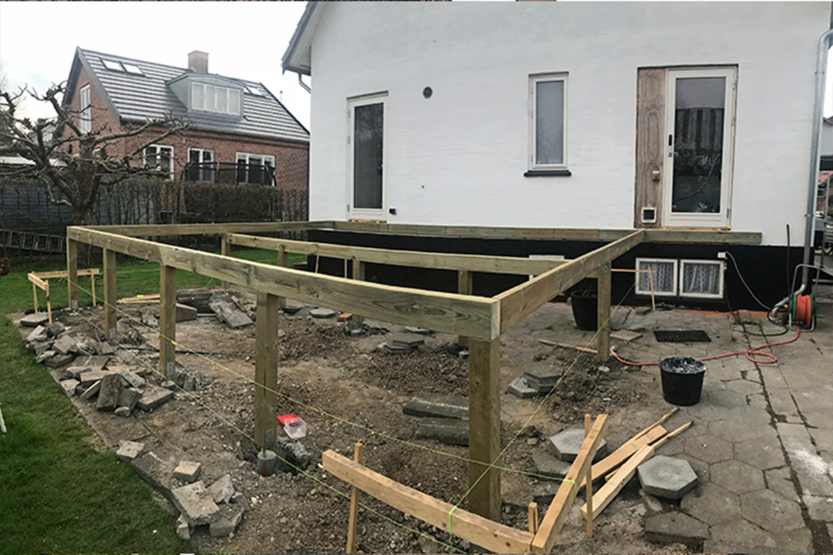 Terassin runko tehdään 48x148 millin lankusta. Kiinnitä aluksi seinään tuleva lankku ja muista jättää sen päälle tilaa terassilaudalle. Sen jälkeen voit sahata tolpat oikean pituisiksi ja asentaa loput runkolankut.
