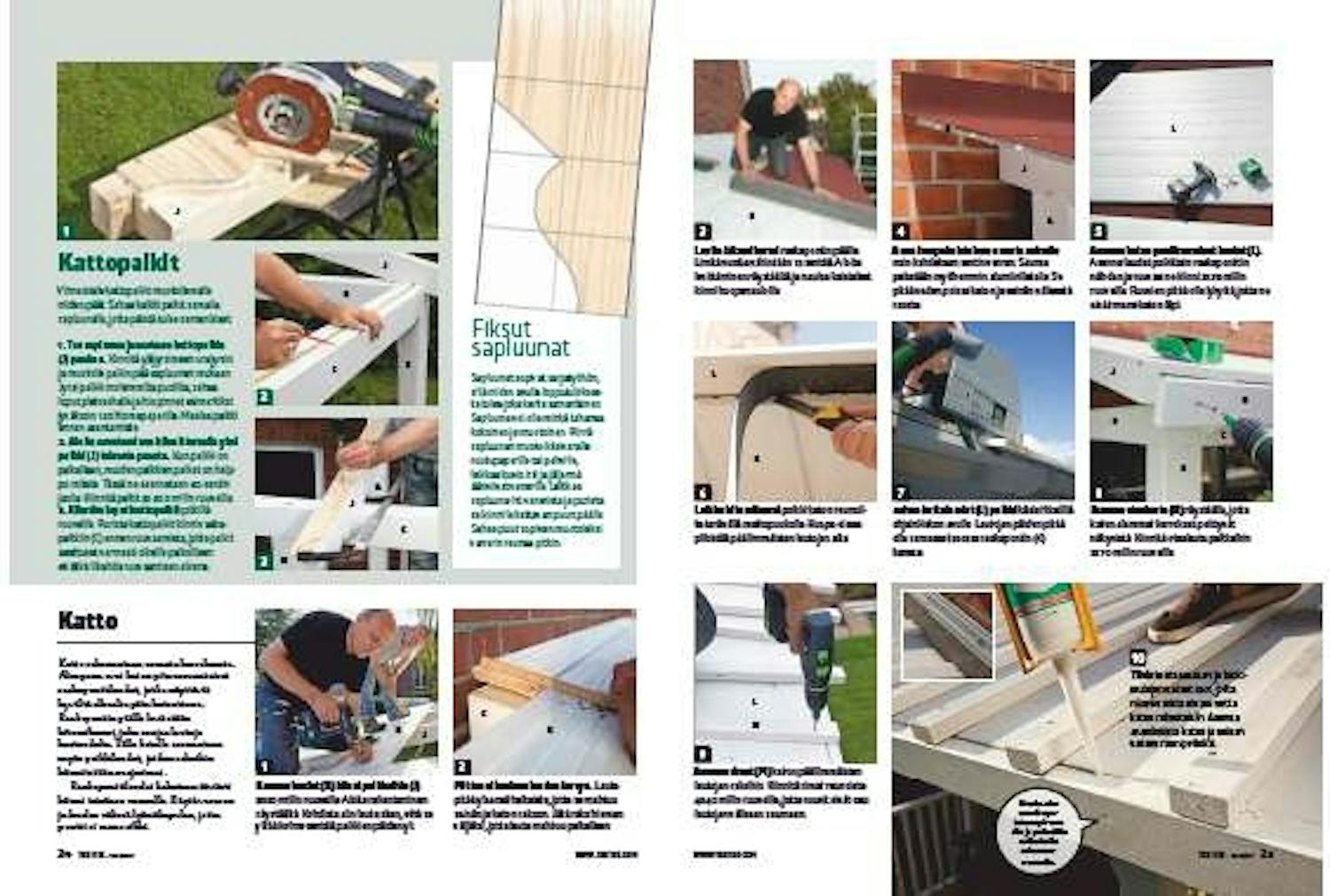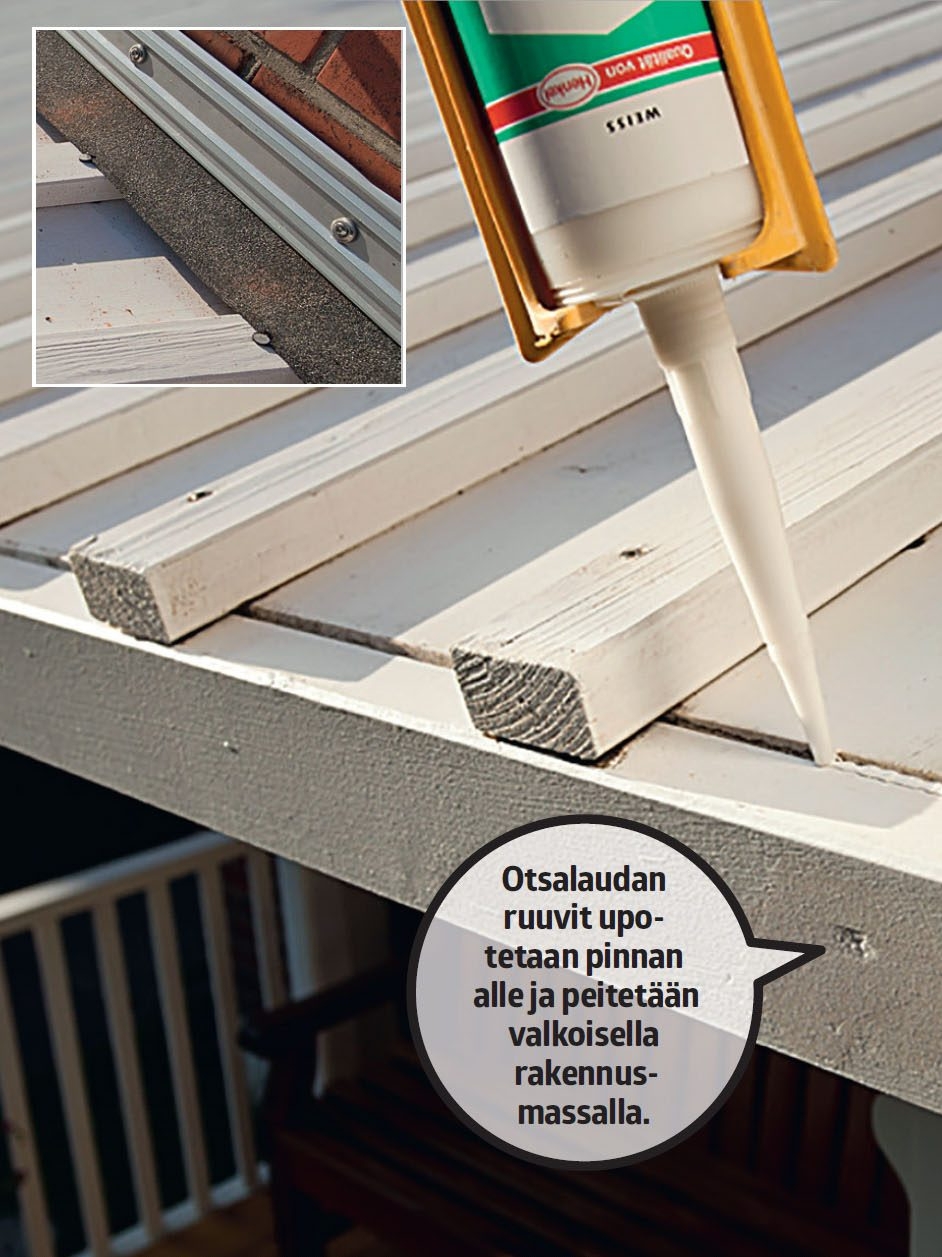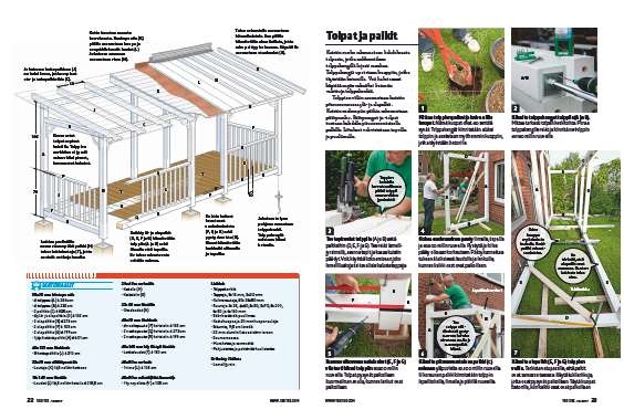 - Tolppakenkiä Tappeja, 8x15 mm, 5x30 mm Kulmarautoja, 50x35x50 mm Ruuveja: 3x35, 4x40, 5x50, 5x70, 8x200, 6x80 ja 6x160 mm Säänkestävää puuliimaa Kattohuopaa ja 20 mm huopanauloja Bitumia, 11,5 cm leveää 22 mm alumiinilista seinän viereen Saumamassaa Mursketta ja sementtiä Pohjustetta ja peittävää kuullotetta