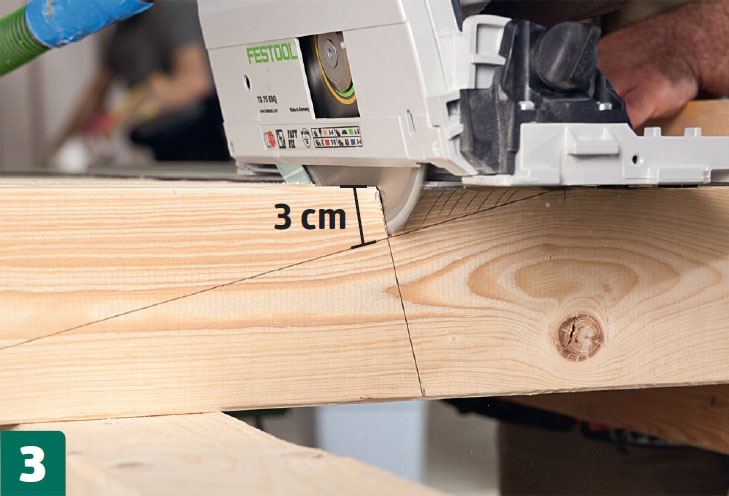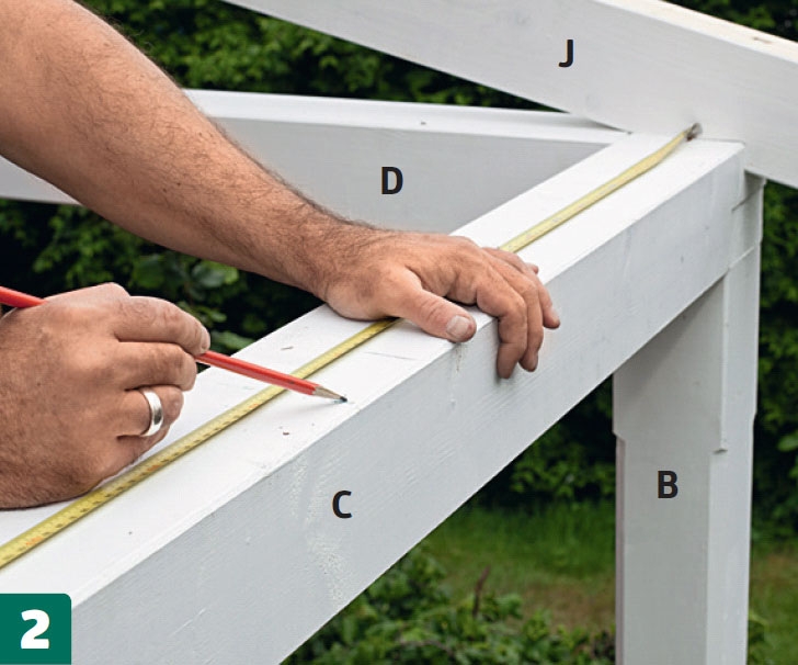 Tee kattopalkkeihin (J) lovet, jotta ne sopivat etupalkkien (C) päälle. Mittaa lovien paikat ja piirrä sahauslinjat. Sahaa puuhun 3 senttiä syvä, vino ura.