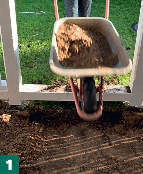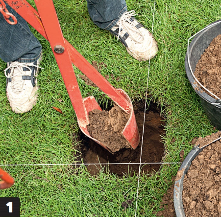 Mittaa tolppien paikat ja kaiva niille kuopat. Nämä kuopat ovat 60 senttiä syvät. Tolppakengät kiinnitetään aluksi tolppiin ja asetetaan myöhemmin kuoppiin, jotka täytetään betonilla.