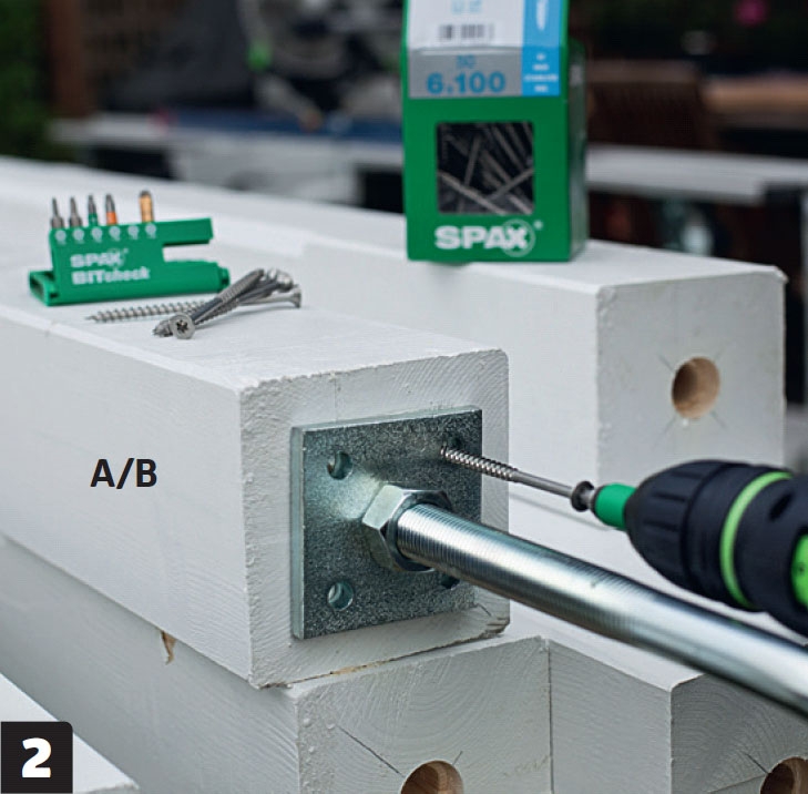 Kiinnitä tolppakengät tolppiin (A ja B). Mittaa tarkasti tolpan keskikohta. Poraa tolppakengille reiät ja kiinnitä ne tolppiin 6x160 millin ruuveilla.