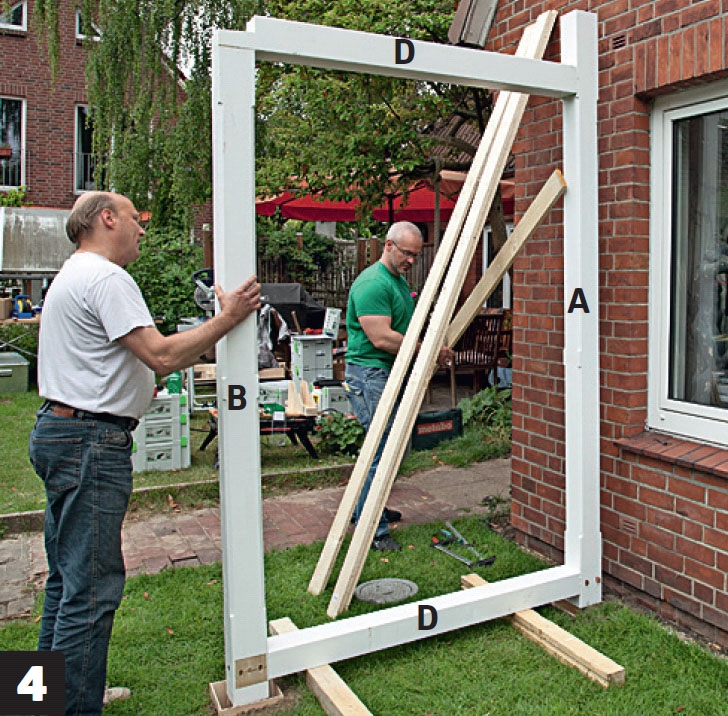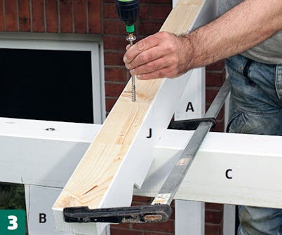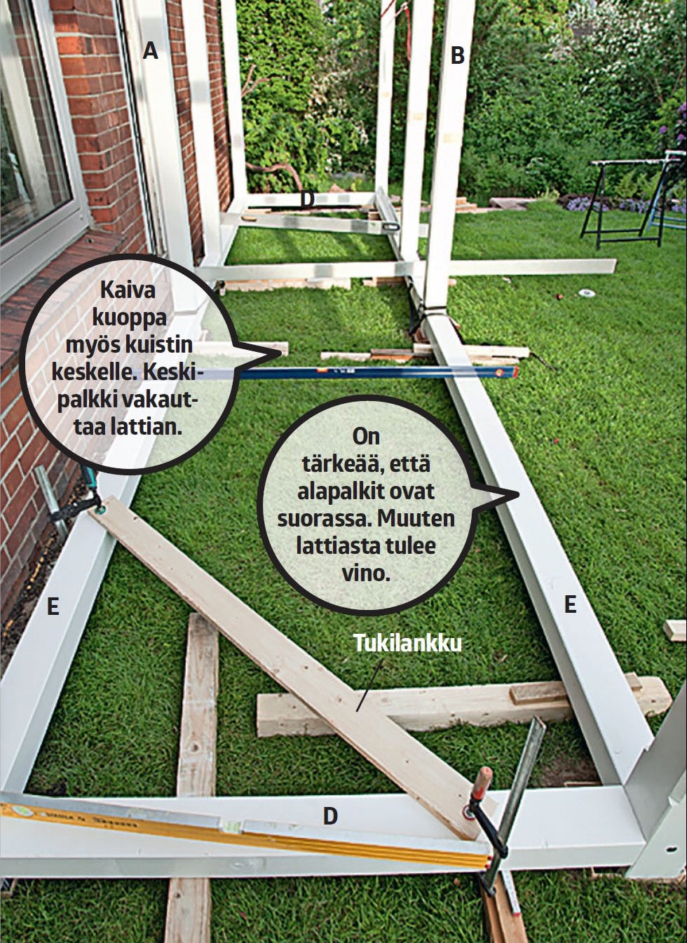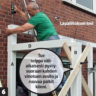 Kiinnitä pituussuuntainen palkki (C) seinään yläpuolelta 8x200 millin ruuveilla. Ulkoreunan palkki kiinnitetään tolppiin lapaliitoksilla, liimalla ja pitkillä ruuveilla.