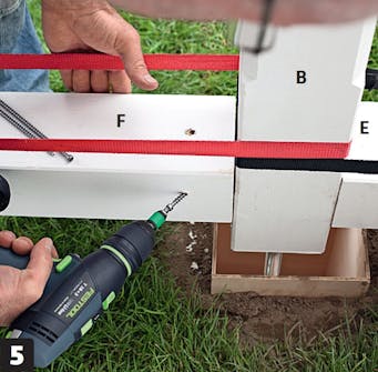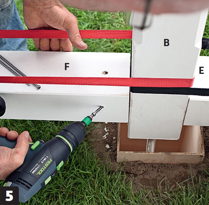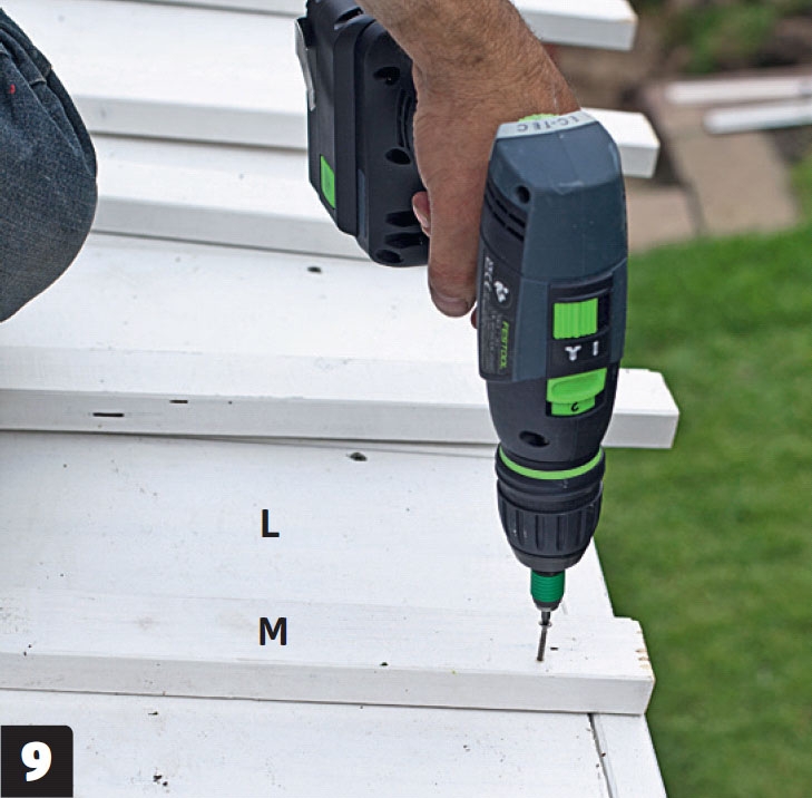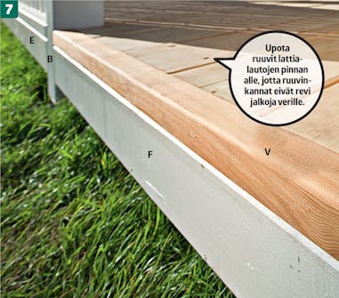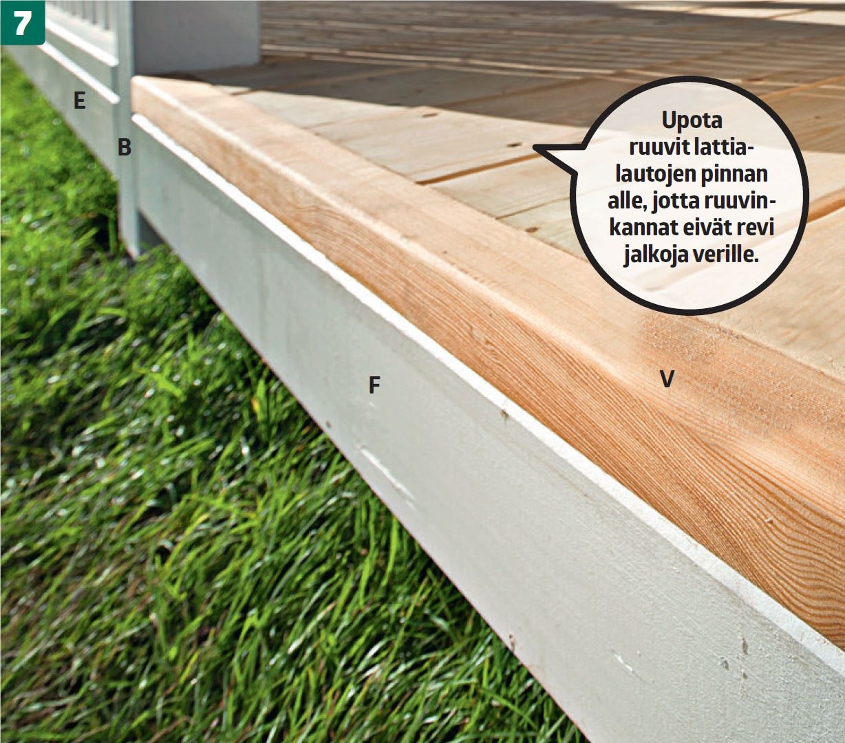 Ruuvaa ulkoreunan alalankut (E, F ja G) viistosti kiinni tolppiin 8x200 millin ruuveilla. Tolpat pysyvät paikoillaan kuorma liinan avulla, kunnes lankut ovat paikoillaan.