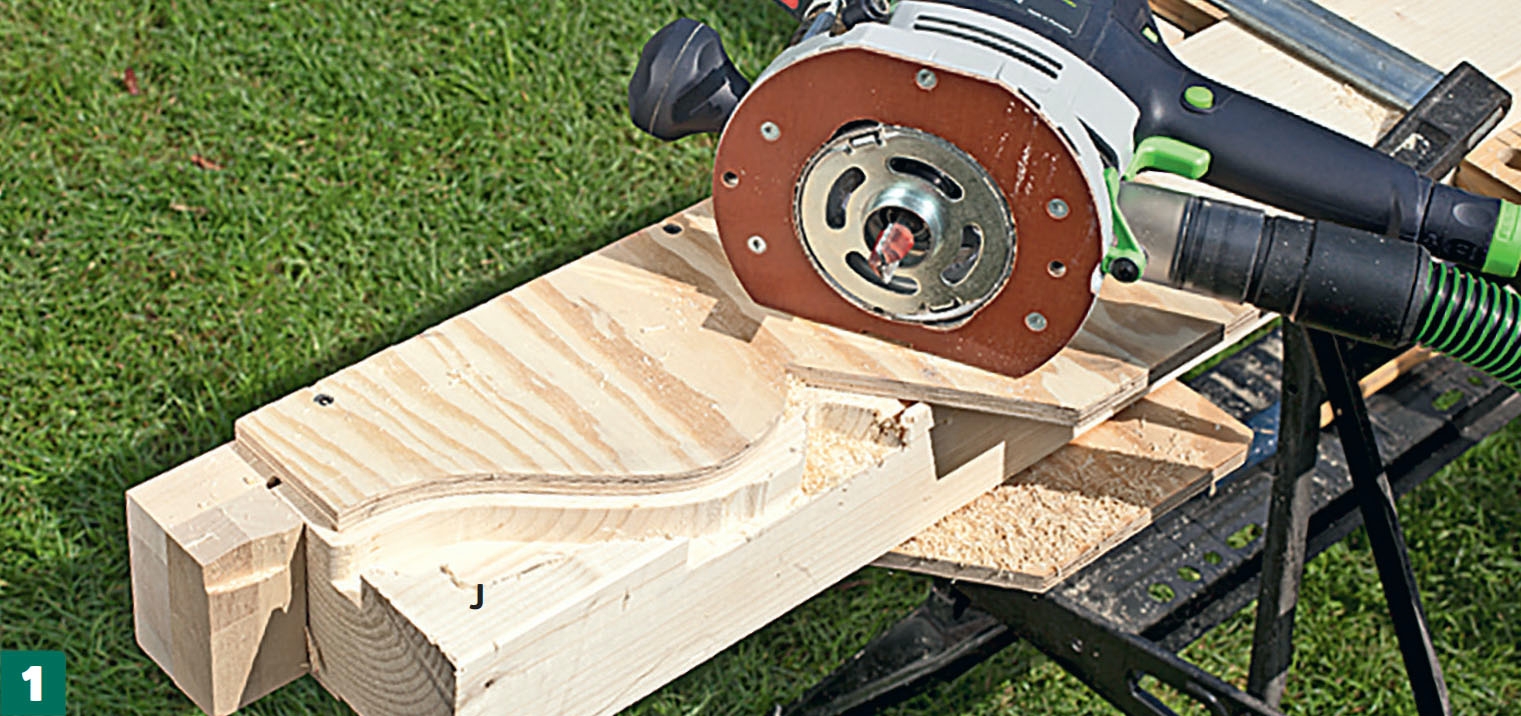 Tee sapluuna ja aseta se kattopalkin (J) päähän. Kiinnitä yläjyrsimeen urajyrsin ja muotoile palkin pää sapluunan mukaan. Jyrsi palkki molemmilta puolilta, sahaa loput pistosahalla ja hio pinnat esimerkiksi jyväkoon 120 hiomapaperilla. Maalaa palkki ennen asentamista.