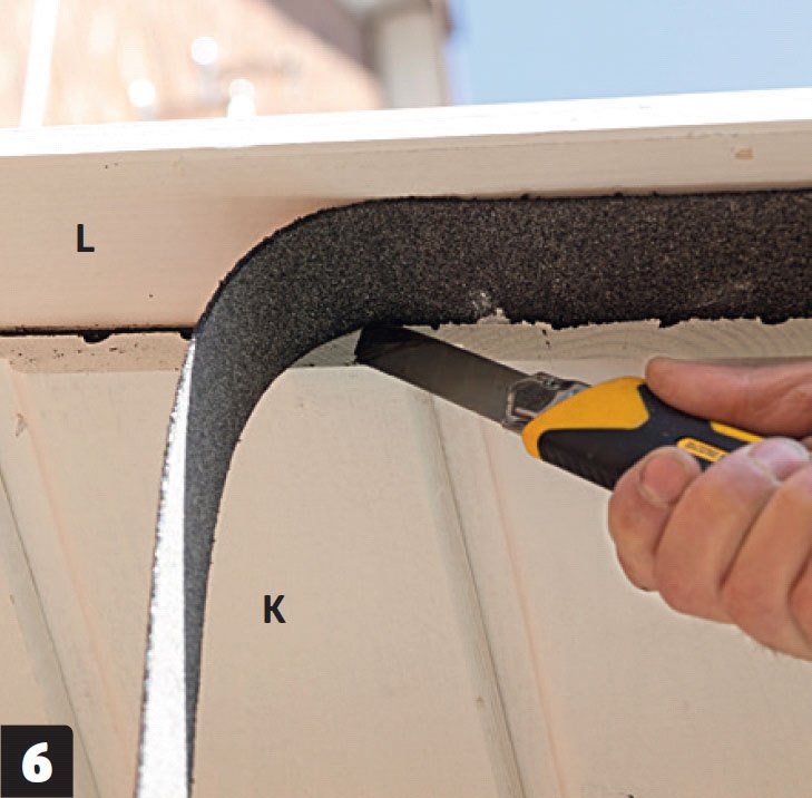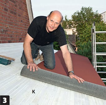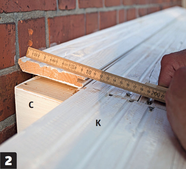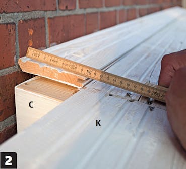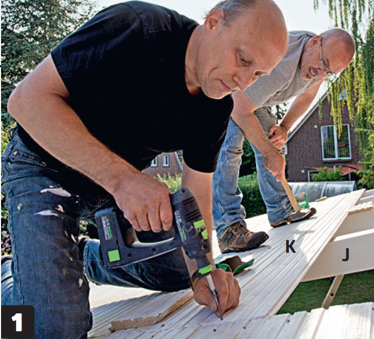 Ruuvaa laudat (K) kiinni palkkeihin (J) 5x50 millin ruuveilla. Aloita rakentaminen räystäältä. Kohdista alin lauta siten, että se yltää kolme senttiä palkkien päiden yli.