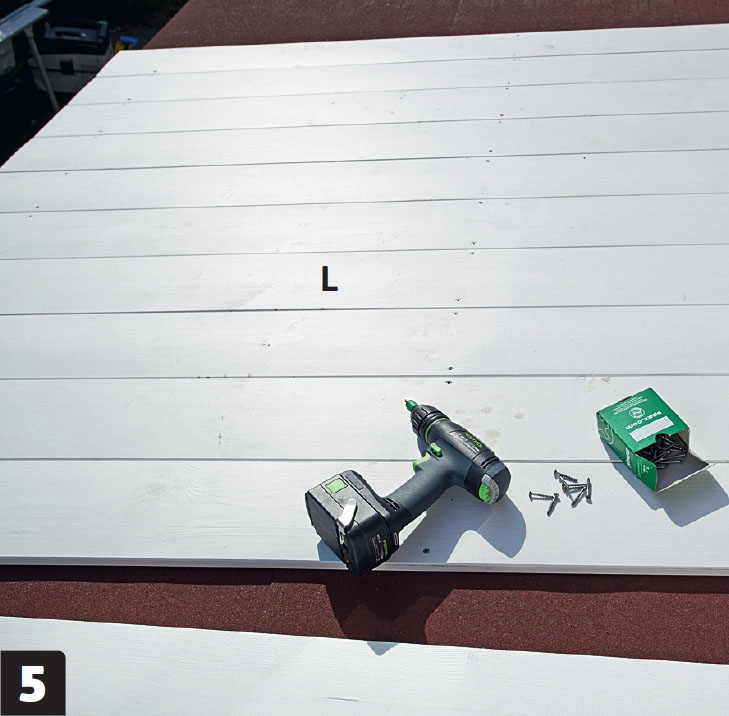Asenna katon päällimmäiset laudat (L). Asenna laudat poikittain raakaponttiin nähden ja ruuvaa ne kiinni 3x35 millin ruuveilla. Ruuvien pitää olla lyhyitä, jotta ne eivät mene katon läpi.