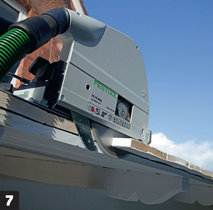 Sahaa kattolaudat (L) poikki käsisirkkelillä ohjainkiskon avulla. Lautojen päiden pitää olla samassa tasossa raakapontin (K) kanssa.