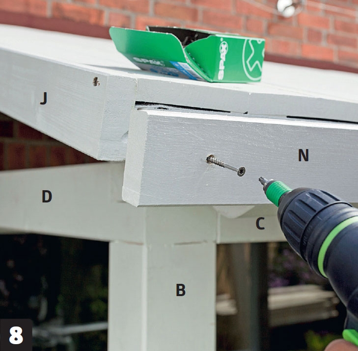 Aloita asentaminen kiinnittämällä yksi palkki (J) toisesta päästä. Kun palkki on paikallaan, muiden palkkien paikat on helppo mitata. Tässä ne asennetaan 60 sentin jaolla. Kiinnitä palkit 8x200 millin ruuveilla.