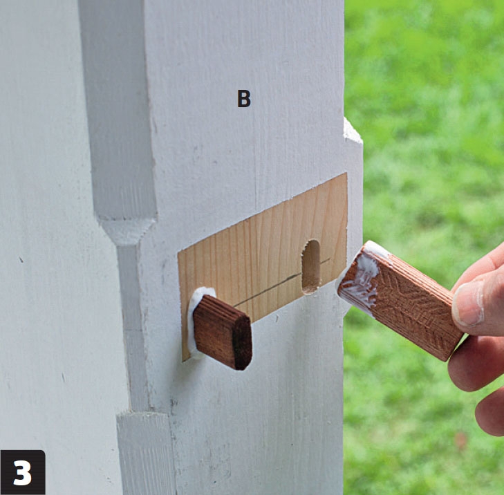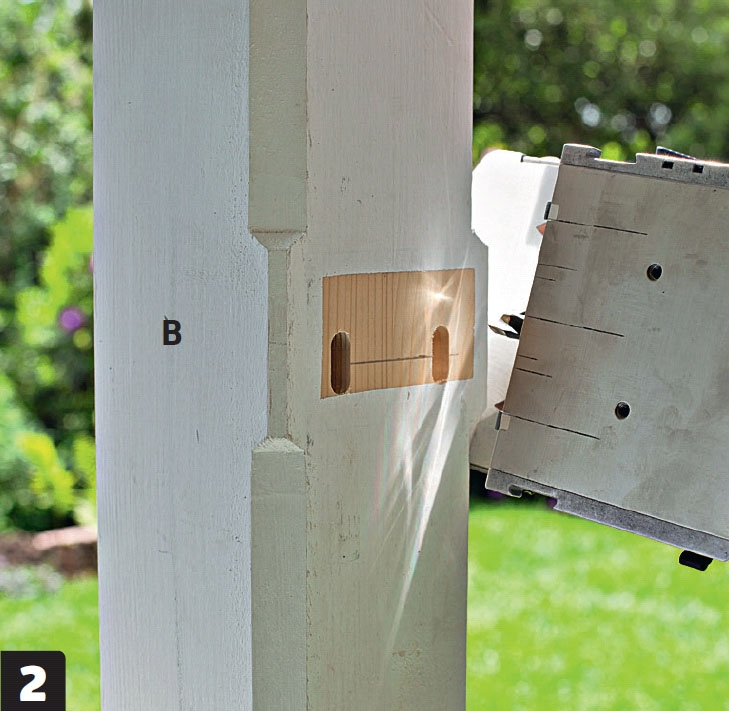 Tee tapinreiät tolppiin (A ja B) sekä palkkeihin (D, E, F ja G). Tee reiät lamellijyrsimellä, asenna tapit ja kasaa kuistin päädyt. Voit käyttää kokoamiseen joko lamelliliuskoja tai tavallisia kalustetappeja.