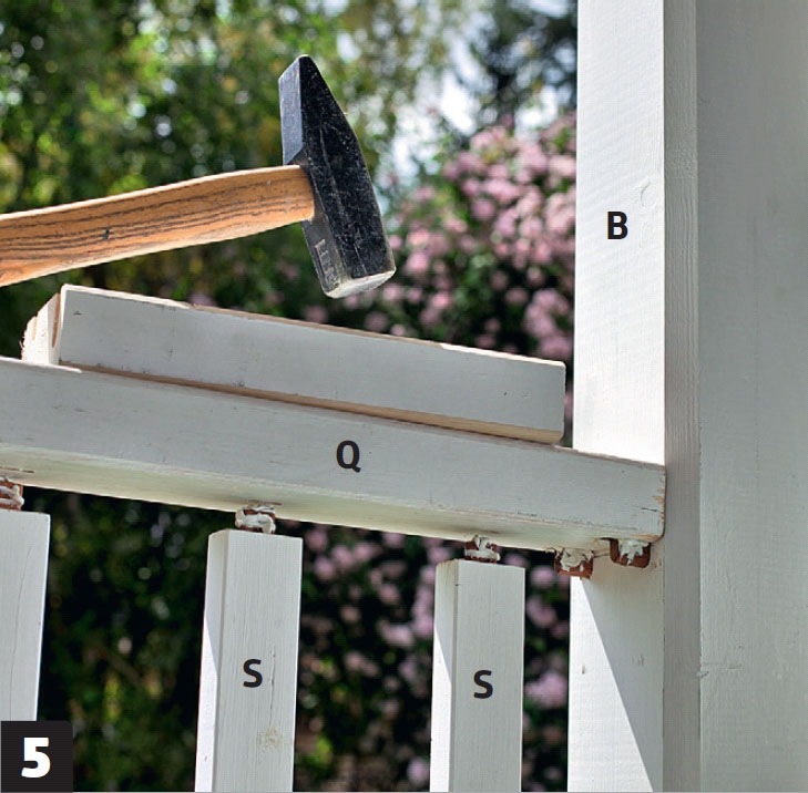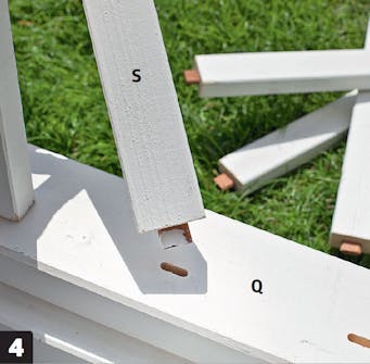 Asenna pystyrimat (S) kaiteisiin. Kiinnitä rimat lankkujen (Q, R ja P) reikiin liimalla ja tapeilla. Paina rimat aluksi kiinni alempaan vaakalankkuun.