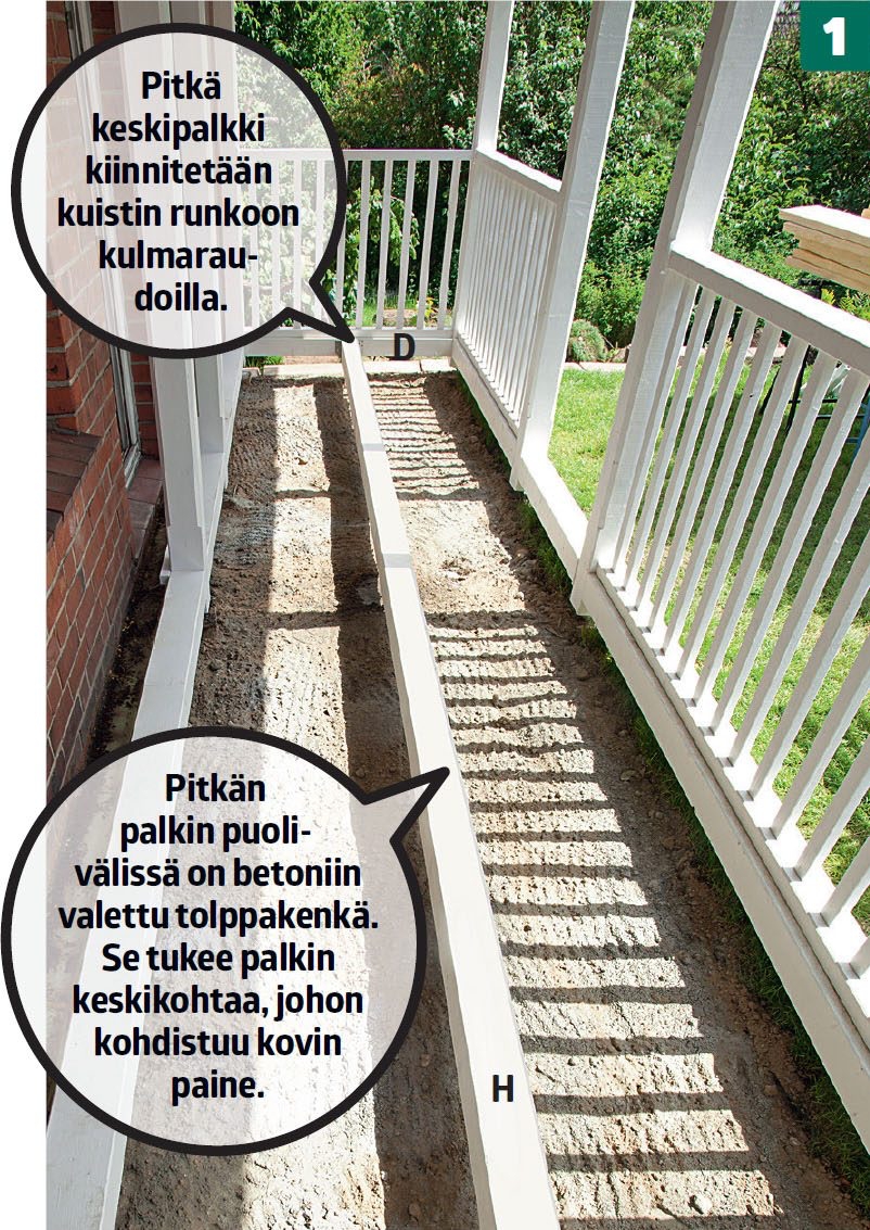 Lopuksi kuistille pitää rakentaa lattia. Aluksi lattian alle pitää asentaa pitkä palkki, joka tukee lautoja keskeltä. Ilman keskipalkkia lattialaudat notkuvat jalan alla.