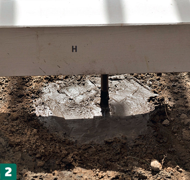 Palkin (H) keskelle pitää asentaa tolppakenkä. Tolppakenkä tukee lattiaa oven edessä paikassa, jossa kävellään eniten. Kaiva aluksi kuoppa, asenna tolppakenkä paikalleen ja täytä kuoppa betonilla.