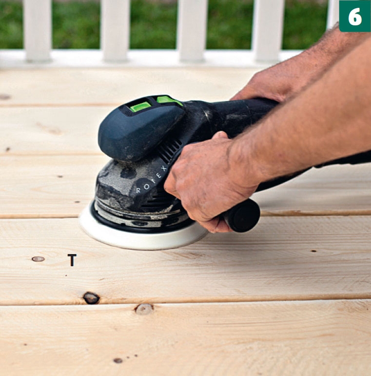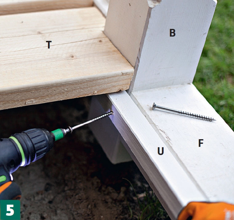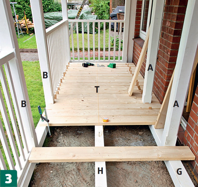 Sahaa lattialaudat (T) ja ruuvaa ne kiinni palkkeihin 6x80 millin ruuveilla. Aloita keskeltä ja etene molempiin suuntiin. Käytä lautojen välissä sopivaa kapulaa, jotta raoista tulee saman kokoiset. Tämän terassin raoista tulee viisi milliä leveät.