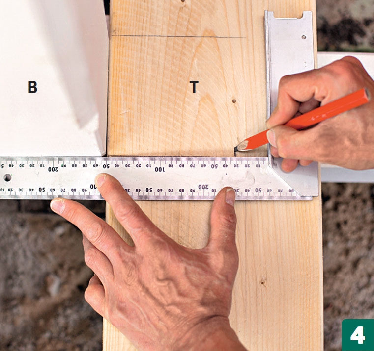 Mittaa etäisyys tolppiin (A ja B). Sahaa lattialautoihin sopivat lovet, jotta laudat (T) asettuvat tiiviisti tolppia vasten.