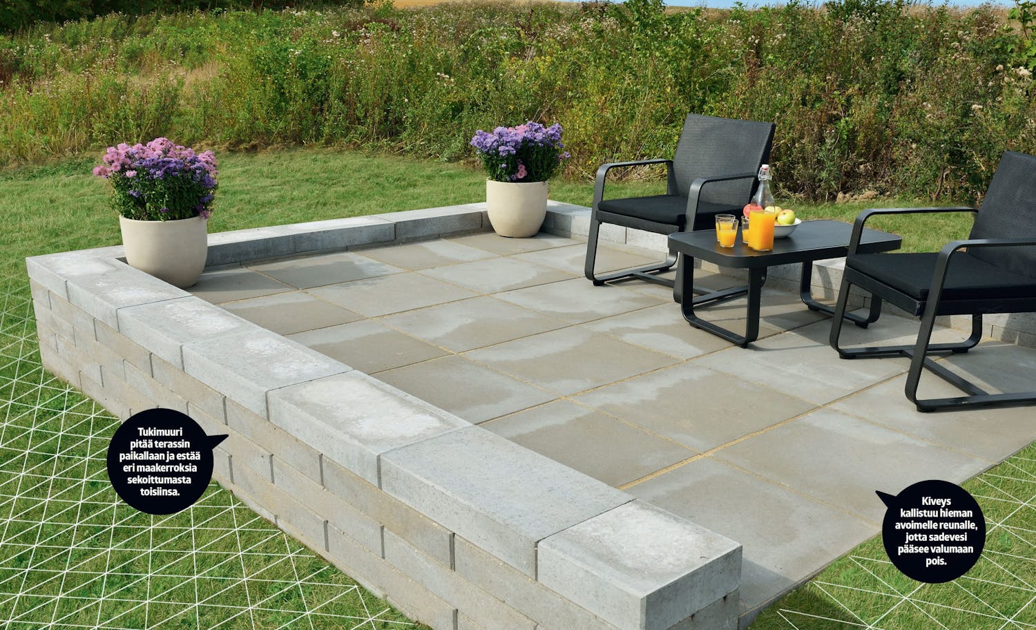 Terassi alkaa olla viimeistelyä vaille valmis. Levitä murskeen päälle 2-4 sentin kerros asennushiekkaa ja lado laatat. Viimeistele tukimuuri päällyskivillä.