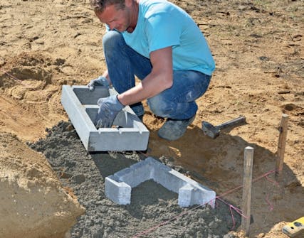 Vala alimpien harkkojen tueksi 10 senttiä leveä ja korkea betonikolmio. Paina muotoon leikatut nurkkapalat betoniin ja jatka työtä muurin toiselle sivulle.