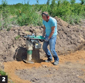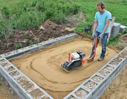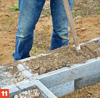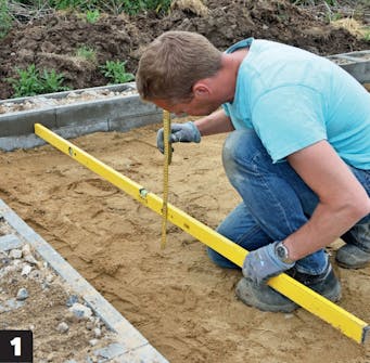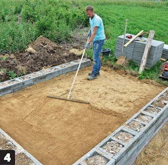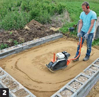 Lisää hiekkaa noin 15 sentin kerroksissa ja tiivistä maa täry levyllä. Jatka, kunnes hiekan pinnasta ylimmän harkon päälle on 23 senttiä. Hiekan päälle pitää mahtua 12 senttiä mursketta, kolme senttiä asennus-hiekkaa ja kahdeksan senttiä paksu laatta.