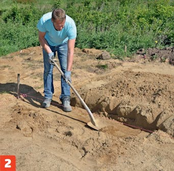 Tee langan alapuolelle 40 senttiä leveä ja tasainen pohja. Viritä langan alin kohta 15 senttiä pohjan yläpuolelle. Langan alle pitää mahtua 10 senttiä betonia.