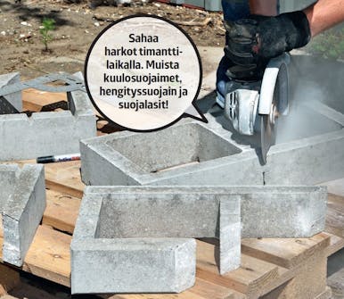 Sahaa harkot. Tukimuurin nurkkaharkot pitää katkaista viistosti kulmahiomakoneella. Piirrä sahauskulmat harkkoihin ja leikkaa varovasti viivaa pitkin. Muuriin tarvitaan myös muutamia puolikkaita harkkoja.