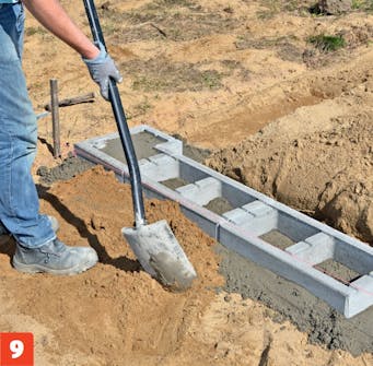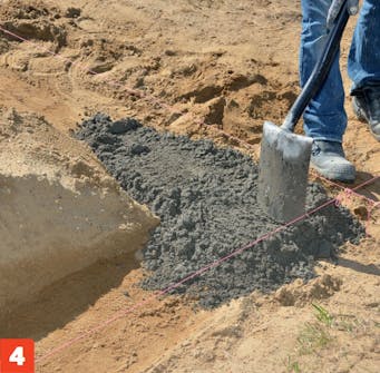Sekoita kottikärryllinen maakosteaa betonia. Varmista, että betoni on sopivan kiinteää. Aloita matalimmasta paikasta ja lapioi muurin alle 10 sentin kerros betonia.