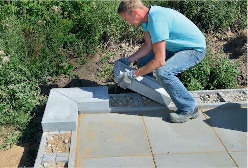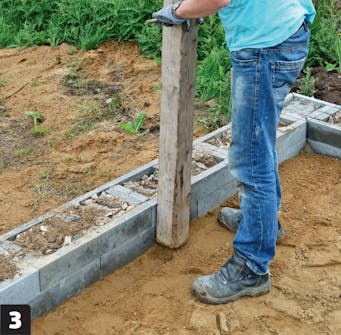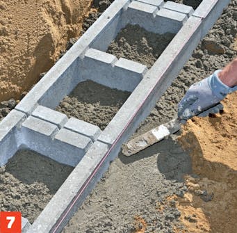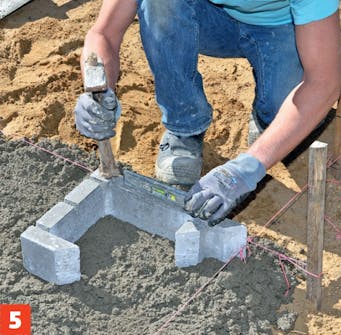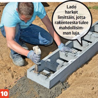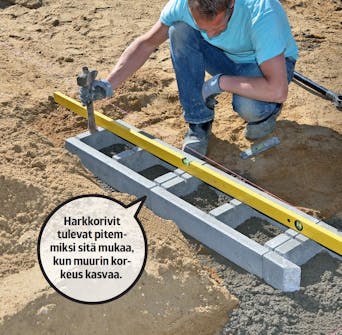 Paina ensimmäinen harkko betoniin siten, että harkon pinta nousee viisi senttiä langan yläpuolelle. Paina loput pohja harkot betoniin. Viimeisen harkon pinta asettuu viisi senttiä langan alapuolelle.
