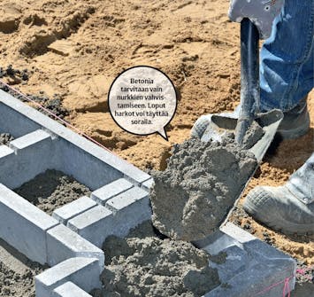 Lado toinen harkkovarvi ensimmäisen päälle. Aloita latominen matalimmasta paikasta ja etene ylösmäkeen. Lapioi alarivin päähän uutta betonia.