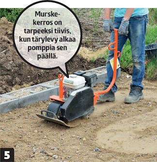 Levitä murske ja tiivistä maa lätkällä. Murskekerroksen pitää olla 12 senttiä paksu. Murske painuu 2-3 senttiä, sitä pitää levittää 14-15 sentin kerros. Muista tehdä murskekerrokseen 1,5-2 prosentin kallistus!