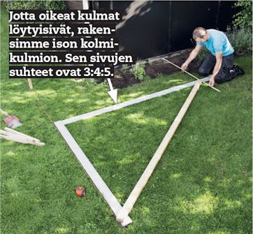 Vedämme kahden uuden kepin väliin narun äsken maahan iskemämme kepin kautta ja vajan julkisivun myötäisesti. Naru osoittaa terassin etureunan. Ensimmäinen keppi poistetaan, sillä se olisi myöhemmin tiellä.