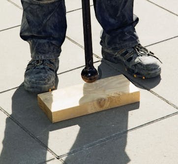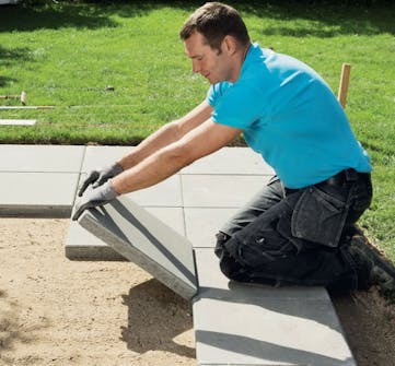 Raskaat laatat on tärkeä saada asen-nettua oikeille paikoilleen heti ensi yrittämällä, jotta hyvin tehty alusta ei vaurioidu. Tue laattaa naapurilaatan reunaa vasten ja laske se sitten rauhallisesti kallistaen paikalleen.