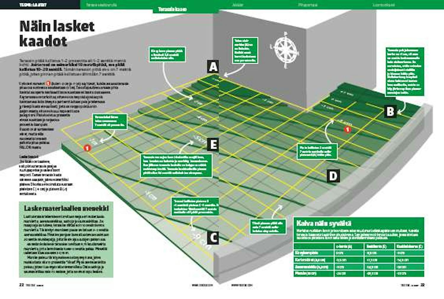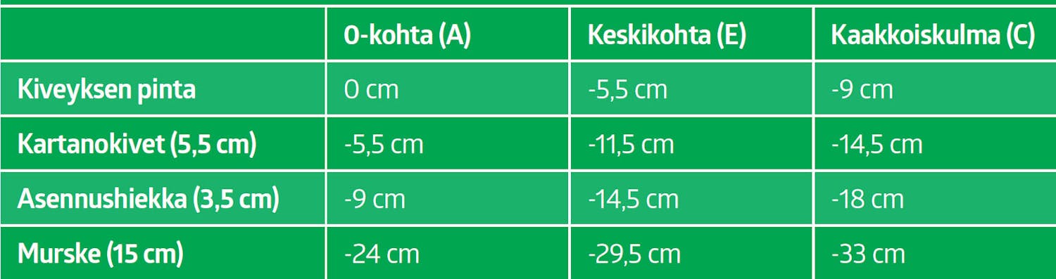 Nollakohta on talon sisänurkassa. Siihen kaivetaan 24 senttiä syvä kuoppa, jotta laattojen alle mahtuu 15 senttiä mursketta, 3,5 senttiä asennushiekkaa ja 5,5 senttiä paksut laatat.