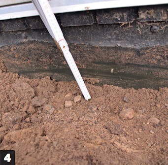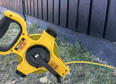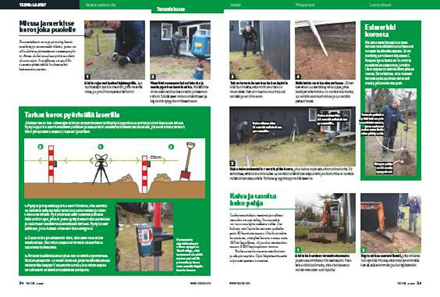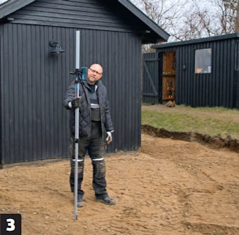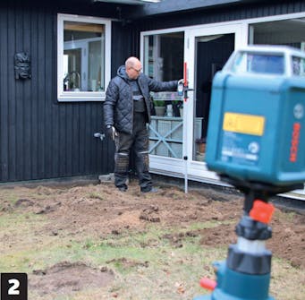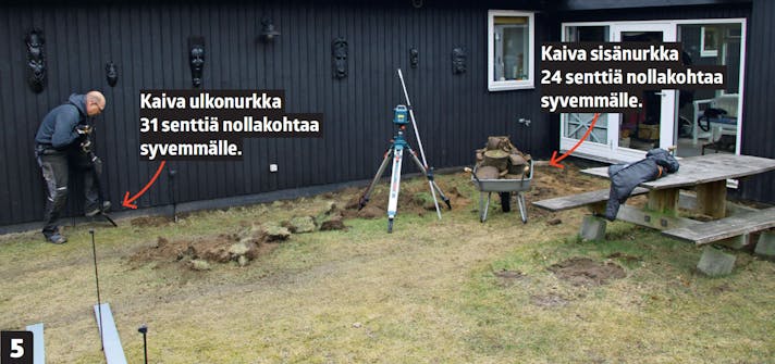 Määrittele seuraavaksi nollakorko ja säädä pyörivän laserin mitta. Nollakohta on terassin sisänurkassa talon ja lisäsiiven välissä. Säädä laser mitan nollakohtaan ja käytä sitä syvyyden mittaamiseen.