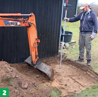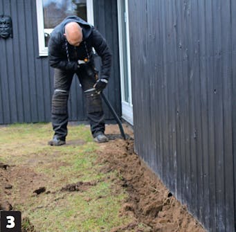 Aloita kaivaminen terassin etuosasta ja peruuta minikaivurilla taaksepäin. Varo taloa siitä huolimatta, että olet kaivanut seinän vierustan auki lapiolla.