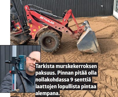 Laatoille tehdään murskeesta tukeva alusta, jotta laatat eivät vajoa tai luisu terassin sivuun. 15 senttiä mursketta riittää, sillä terassilla ei ajeta autoilla.