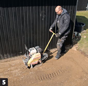Voit käyttää minikaivurin tai -kuormurin kauhaa murskeen tiivistämiseen. Vedä kauhaa pintaa pitkin, kunnes murskekerros on tiivis.