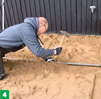 Suorista hiekan pinta vetämällä linjaria taaksepäin siksak-liikkeellä vesiputkia pitkin. Tasoita ensimmäinen osa, nosta putket varovasti ylös, täytä niiden urat ja upota putket uudestaan hiekkaan.
