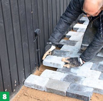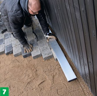 Tämä sokkeli on niin suora, että kivet voi asentaa sen mukaan. Jos terassin vieressä ei ole suoraa linjaa, voit käyttää linjareita tai linjalankaa, jotta rivit pysyvät suorina.
