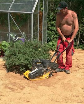 Levitä luonnonkivien alle 10 sentin kerros mursketta ja tiivistä kerros tärylevyllä. Aja lätkällä pituus- ja poikkisuunnassa. Kiveykselle ei tarvitse tehdä kallistusta, sillä vesi imeytyy nopeasti maahan soran läpi.