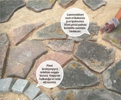 Päätä keskiympyrän paikka. Pystytä terassin keski-pisteeseen rautakanki ja kiinnitä siihen naru. Sido narun toiseen päähän pieni keppi ja piirrä keskiympyrän ääriviiva sen avulla. Asenna noppakivet viivan ympärille. Jätä kivien väliin noin 3-4 senttiä leveät raot, jotta kivien väliin jää tilaa soralle.