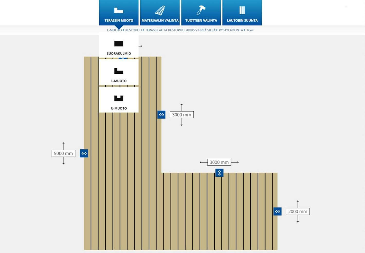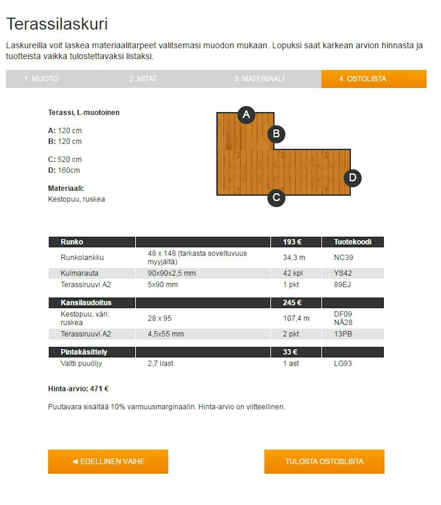 Starkin laskurissa on kaksi erilaista terassin muotoa, mutta ostoslista on Keskon sovellusta laajempi: laskuri arvioi myös lankkujen, ruuvien, kulmarautojen ja pintakäsittelyaineen määrän.