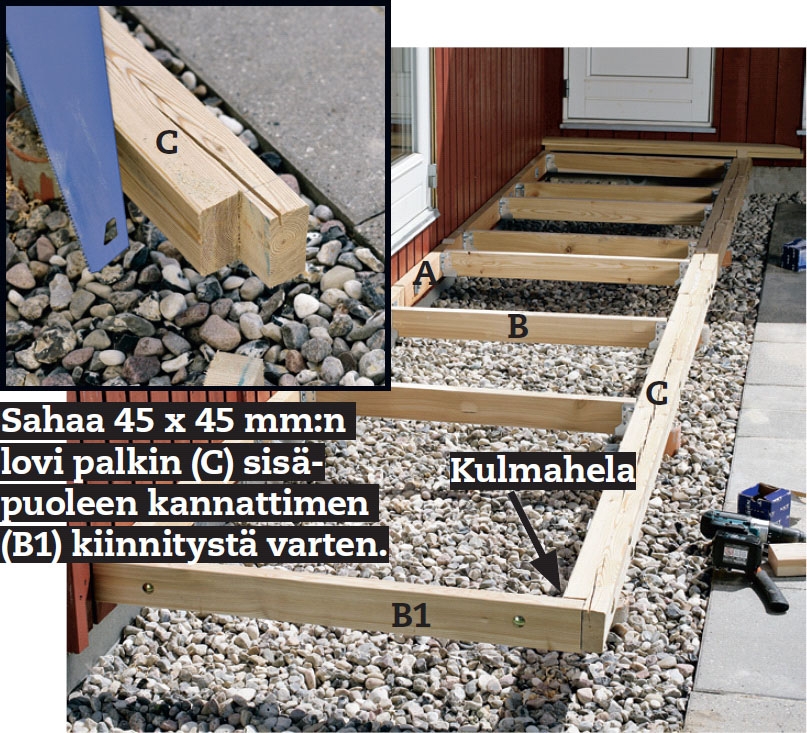 Aluksi rakennetaan tukeva kehikko, joka kestää terassin painon. Koska esimerkis-sämme käytetään lehtikuusta, ongelmia tuottaa pitkä kannatinpalkki (C), sillä lehtikuusella on taipumus vääntyä. On helpompi hankkia kaksi 3 metrin lank-kua kuin yksi 6 metrin lankku. Lehtikuusen voi hyvin korvata kestopuulla (AB).