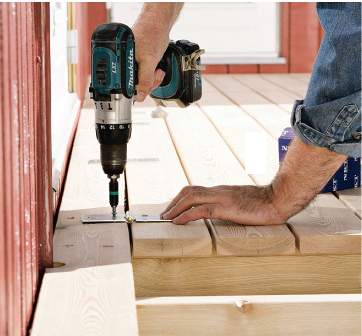 Sijoita vaakakannakkeen (A) ylä-reuna noin 10 cm oviaukon ala-reunan alapuolelle. Se vastaa kahden terassilaudan paksuutta + 5 cm:n etäisyyttä sisäänkäynnistä. Poraa ruuvinreiät kannattimeen porakoneella.