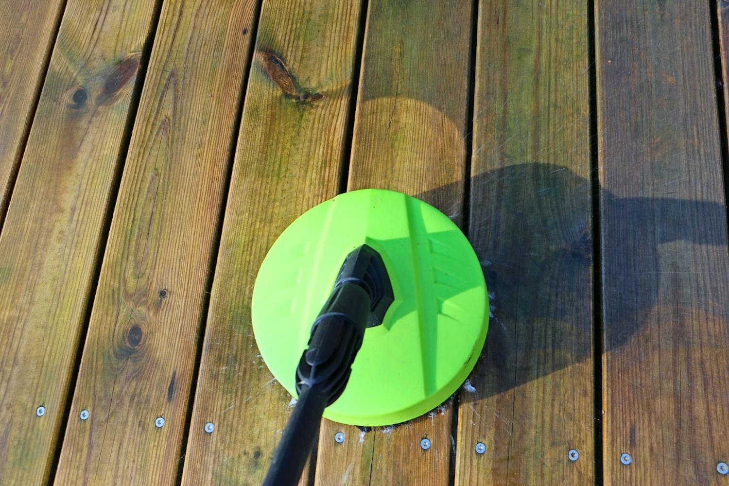 Painepesurin painetta voi säätää. Terassin pesemiseen kannattaa käyttää tarkoitukseen erikseen suunniteltua harjapäätä, sillä se ei vahingoita puuta. Jos sinulla ei ole terassipäätä, vähennä pesurin painetta, sillä puun pinta voi särkyä, jos terassi pestään täydellä teholla ja tavallisella suihkulla.