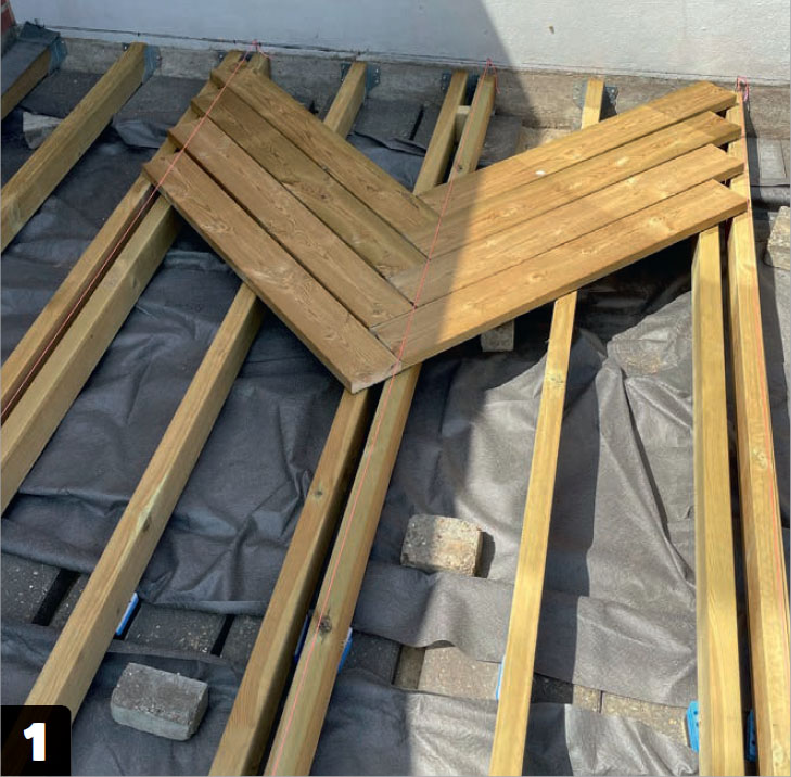 Aseta laudat kymmeneen liitokseen ja ruuvaa ne kiinni. Tee yksi liitos kerrallaan. Varmista, että jokainen lauta tulee samansuuntaisesti ja että kuvion kärjessä on 90 asteen kulma.