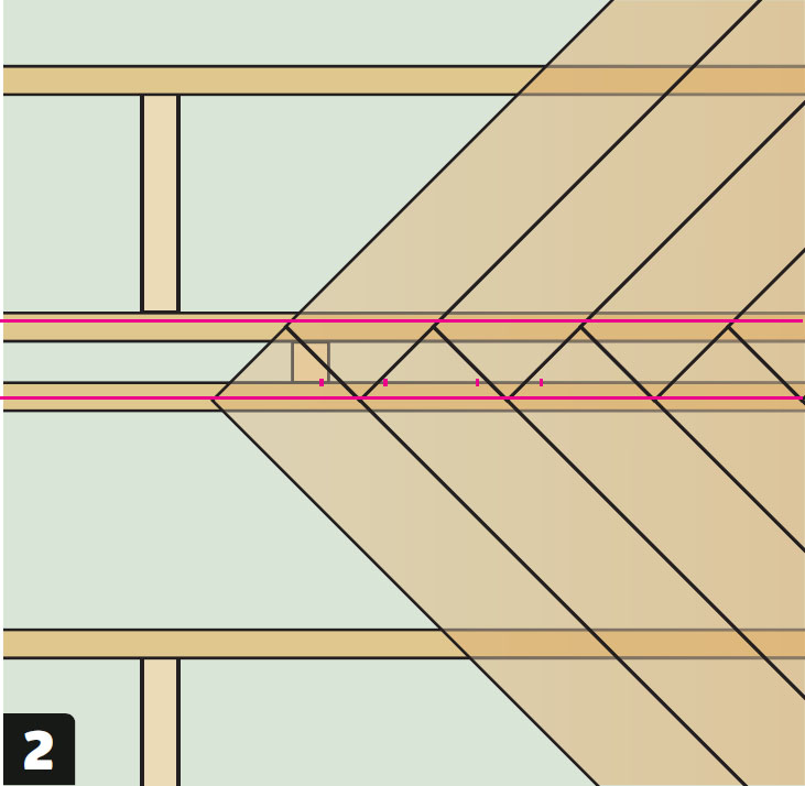 Liitoksen tulee levätä kummankin palkin päällä. Kukin palkki kantaa kuitenkin vain laudan, joka alkaa liitoksen samalta puolelta. Ruuveja tulee kaksi peräkkäin suoraan linjaan palkkien kanssa.