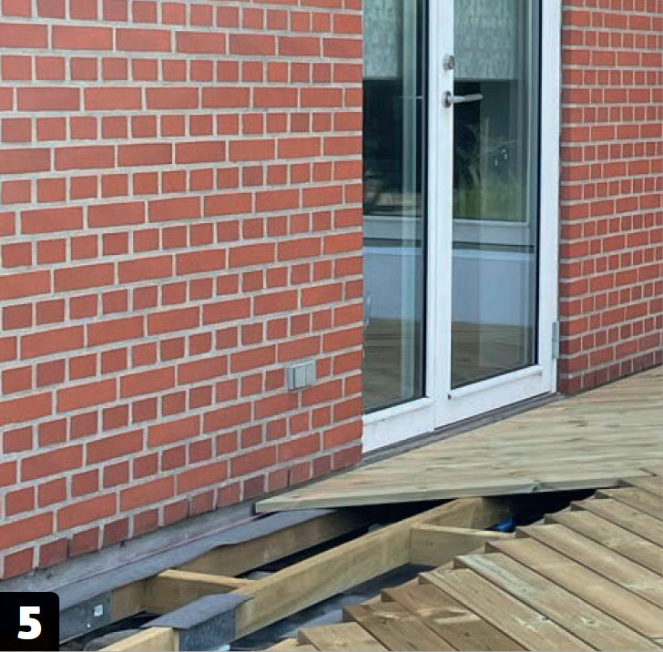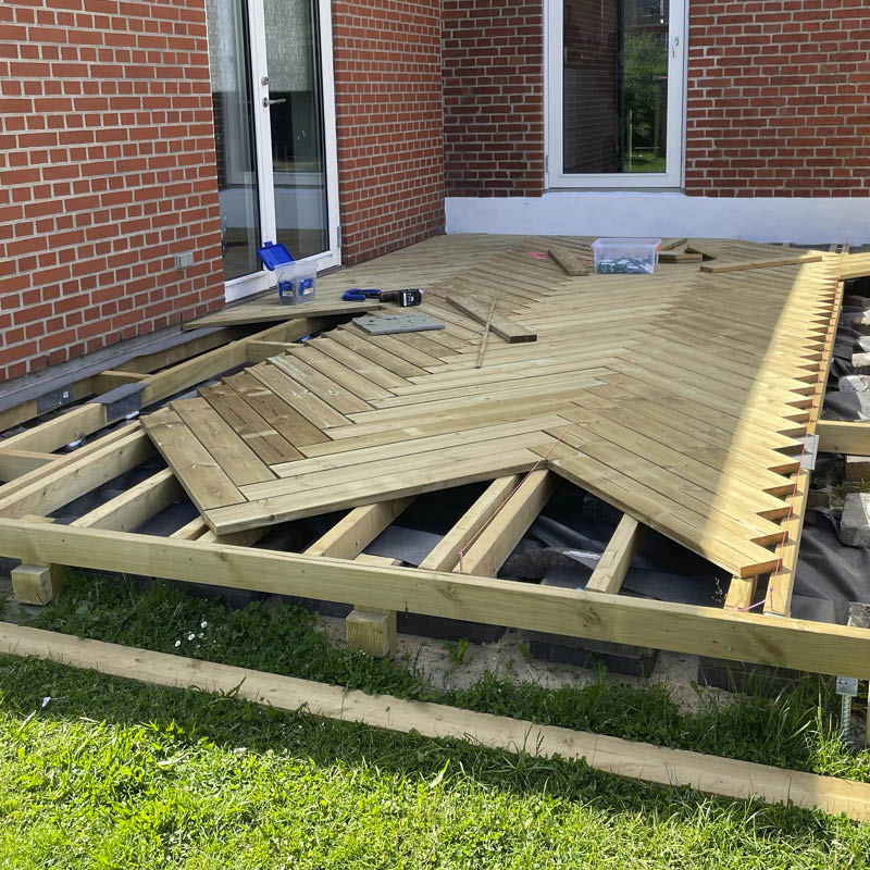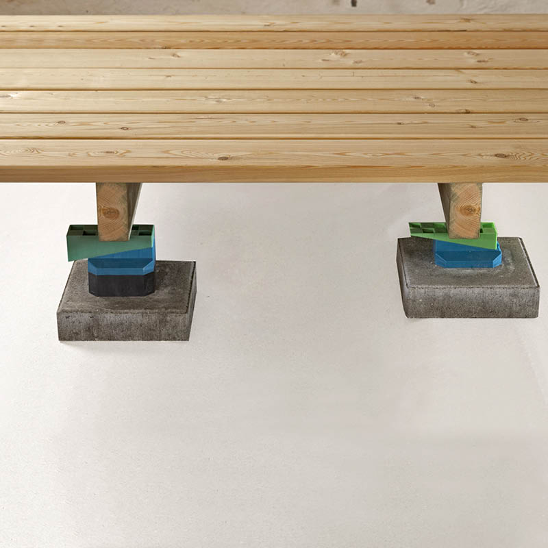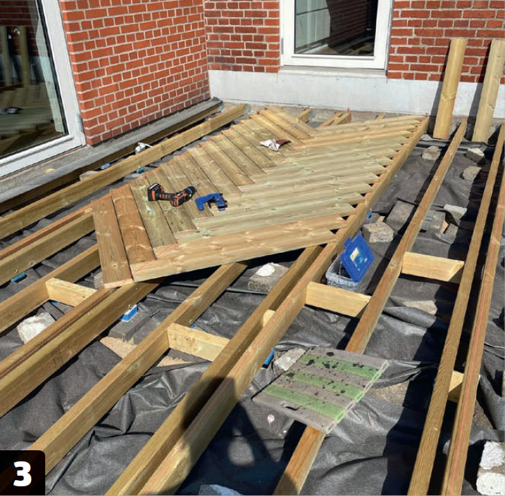 Terassi asetetaan betonilaattojen ja kiilojen päälle. Vaikka alusta on tasoitettu, runko tulee laattojen päälle ja se tuetaan kiiloilla, jotta pinnasta tulee täysin tasainen.